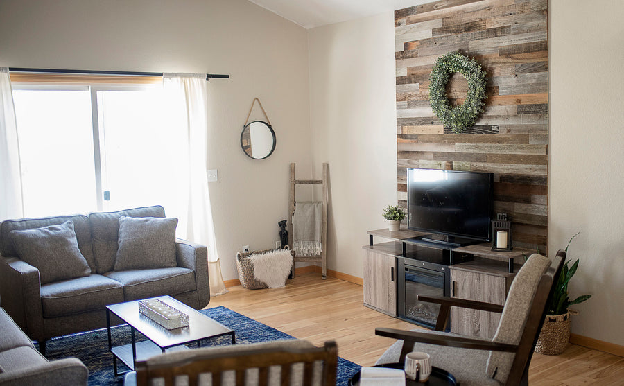 "We love how simple this project was and how the feature wall turned out! It added a focal point to the room which was just what we needed and gives a bit of a rustic yet modern feel."